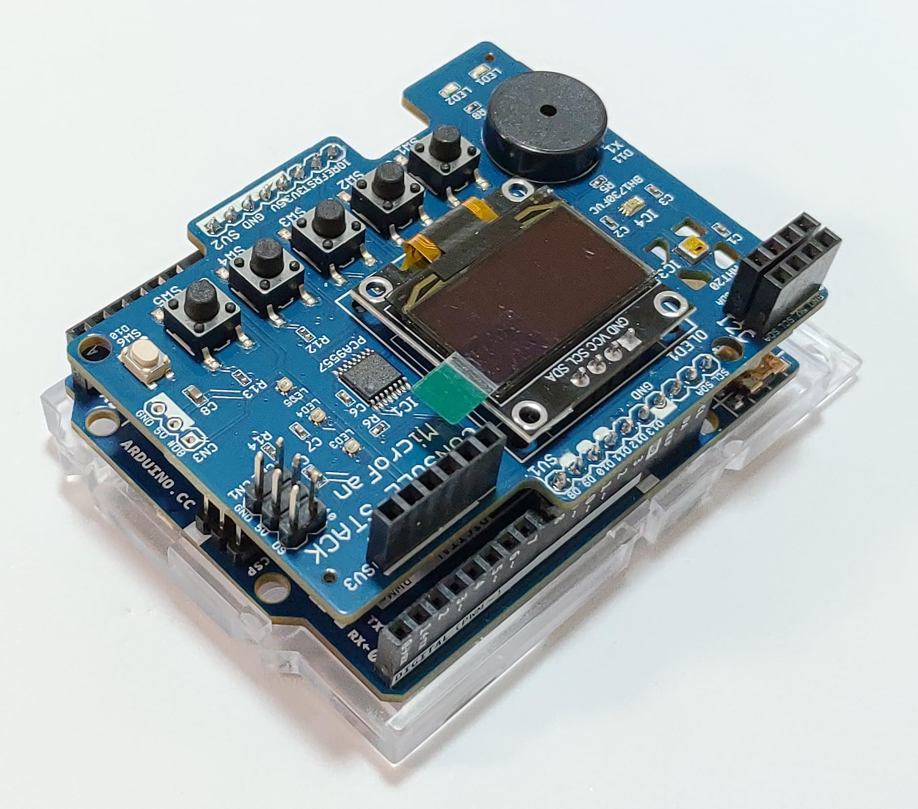 - Arduino UNO R4/R3にOLEDディスプレイと主要な入出力とセンサーを追加するシールドキットです。Arduino UNO等の開発ボードはは別途ご用意ください。
