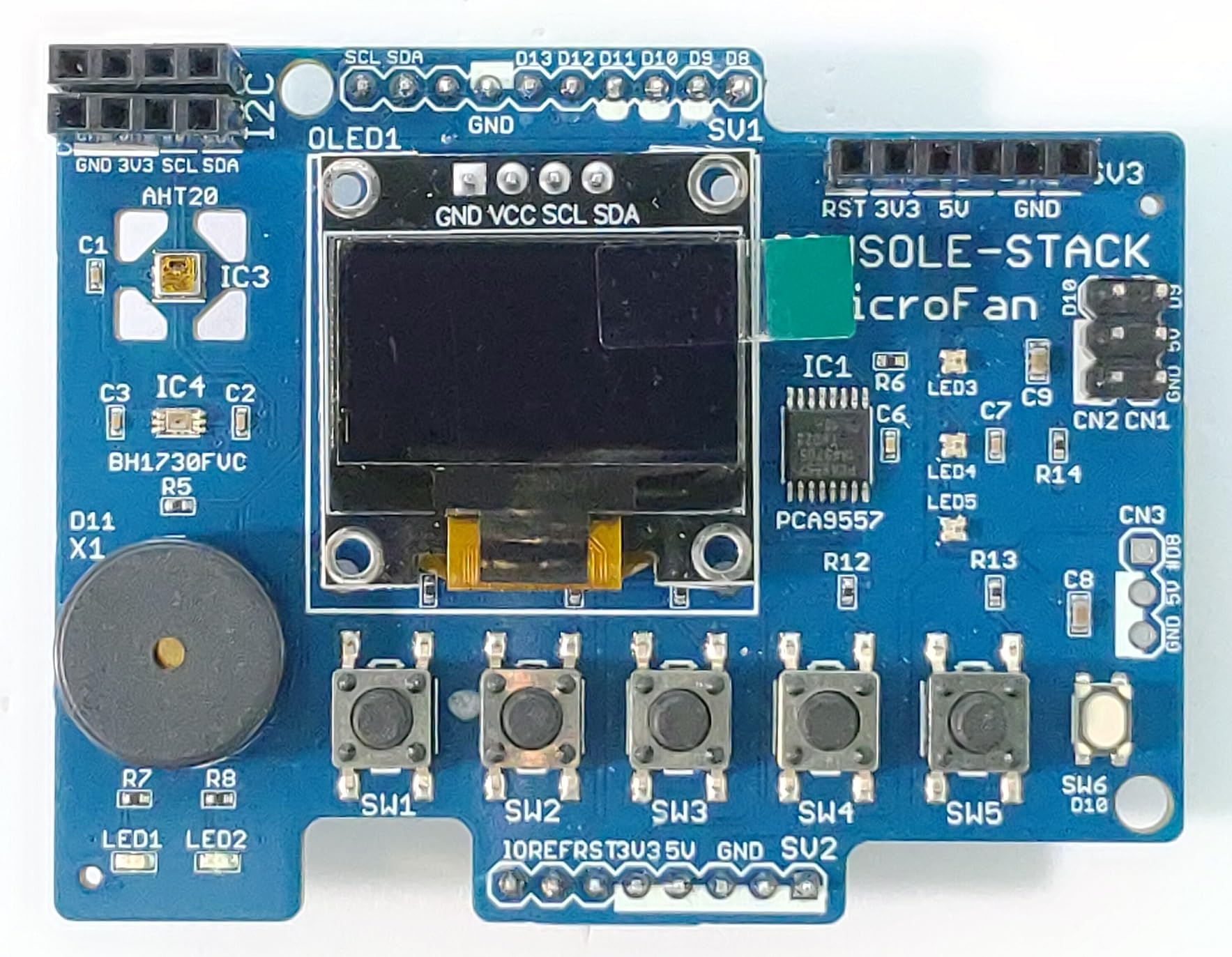 CONSOLE-STACK (OLEDディスプレイ、加速度、温度・湿度、照度センサー、カラーLEDx3、LEDx2、圧電スピーカー、タクトスイッチX6搭載)シールドキット