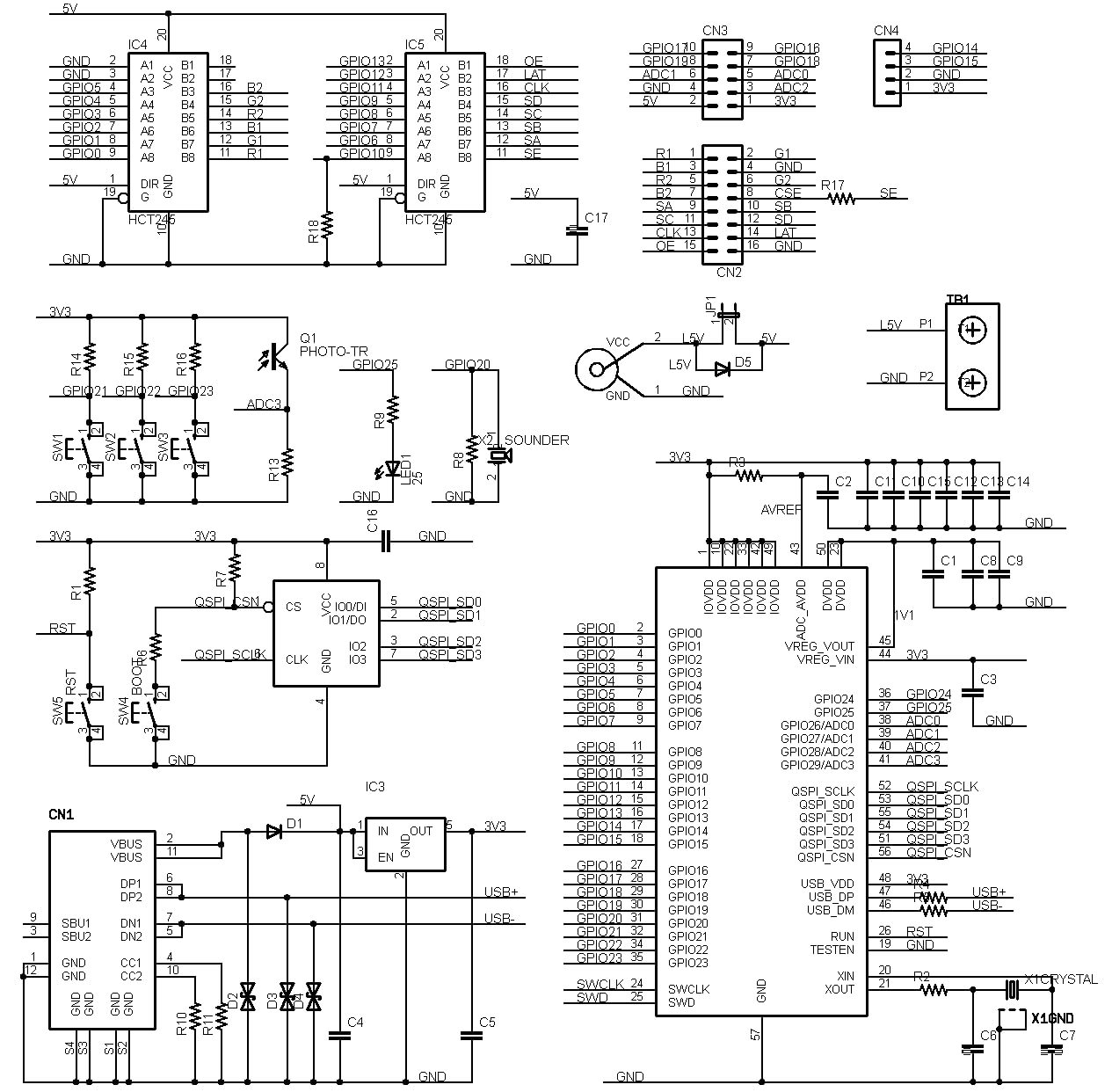 - HUB75(E)インターフェースを使用したLEDパネルを制御することができます。HUB75(E)インターフェース用に3.3V->5Vの変換回路を備えており、LEDパネルを安定して制御できます。