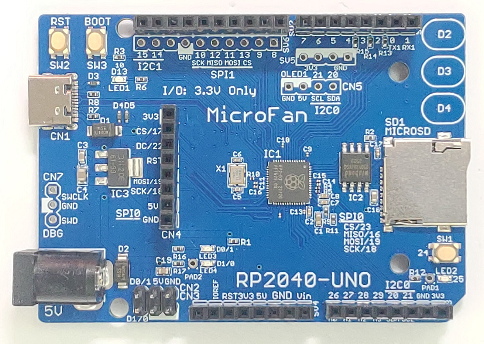 - RP2040のUNO形状の開発ボードです。PICOの8倍の16MFlashを搭載しています。